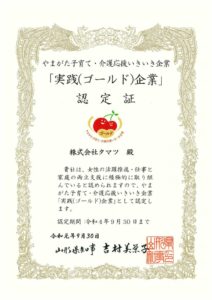 やまがた子育て・介護応援いきいき企業「実践(ゴールド)企業」に認定されました。
