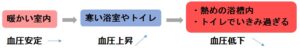 ヒートショックとは、この急激な温度差により血圧が大きく変動することで失神や心筋梗塞、脳梗塞などの疾患を引き起こし、身体へ悪影響を及ぼすことです。