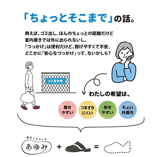 手を使わずにスポっと履けて、脱げにくい、安心感のあるつっかけで、気軽に外へ出てみませんか?