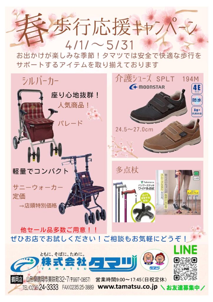 鶴岡店では4/1~5/31まで春の歩行応援キャンペーン開催中です。